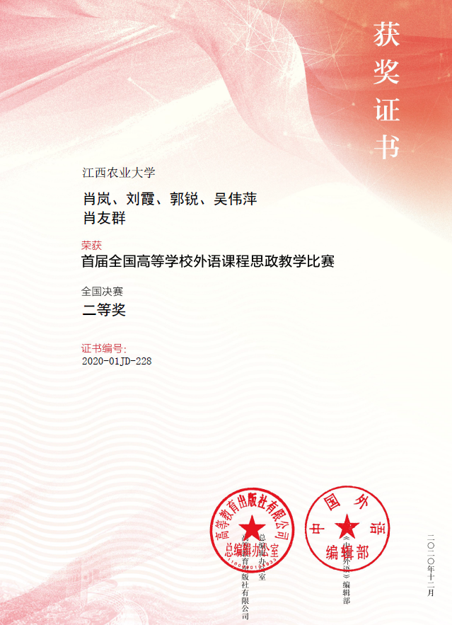 近日,首届“全国高等学校外语课程思政教学比赛”决赛结果公布,伟德外国语学院青年教师肖岚、刘霞领衔的教学团队获得大学英语组全国二等奖。