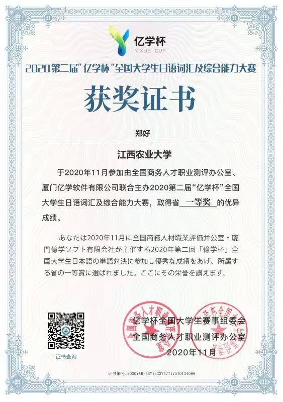 伟德外国语学院日语专业学生在郑光峰等老师的辛勤指导下,历经两轮比赛后,日语1701班罗松、郑好分别以全国第30名、第80名的优异成绩荣获江西省一等奖,此外,有5位学生进入江西省前10名。