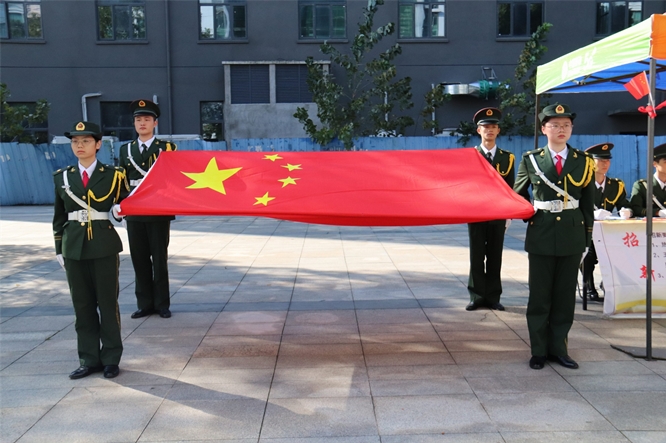 学院教官队队员身穿绿色军装,在E教大楼摆点展旗,负责维护迎新秩序,进一步配合学院的迎新工作。教官队队员气宇轩昂,精神抖擞,缓缓展开鲜艳的五星红旗,怀着拳拳爱国之心,护国旗之荣光。他们整齐、肃静的军姿展现当代大学生团结进取,积极向上的精神风貌,同时表达对祖国深沉的爱与崇高的敬意,让爱国主义情怀激荡青春力量。