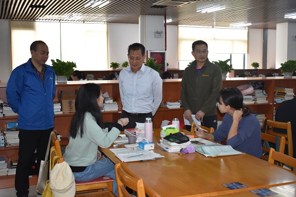 9月30日上午9点,副校长贺浩华到图书馆检查指导工作,实地查看了图书馆自修室、报告厅和二楼新书推荐区、中庭等区域,与考研学生亲切交谈,并对假期的工作安排提出具体要求。