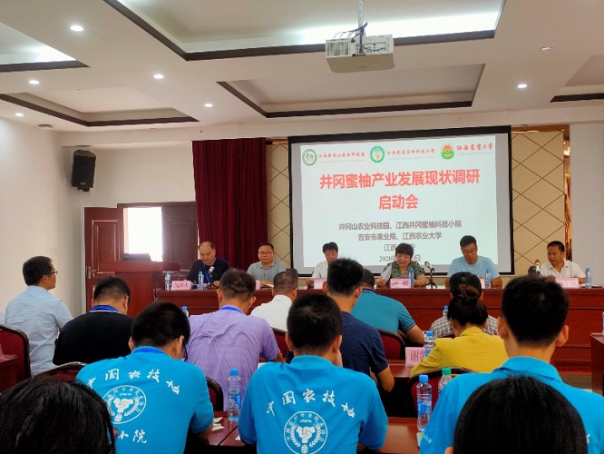 7月20日上午,我校井冈蜜柚科技小院在井冈山农业科技园区召开井冈蜜柚产业发展现状调查启动会。江西省科协、吉安市科协、吉安市果业局、井冈山农业科技园、校科技处负责人出席会议,吉安市园艺场、各县(区)果业局(农业农村局)等单位领导及伟德植物营养研究领域相关师生代表参加会议。启动会由井冈蜜柚科技小院负责人、国土资源与环境学院副院长周春火主持。