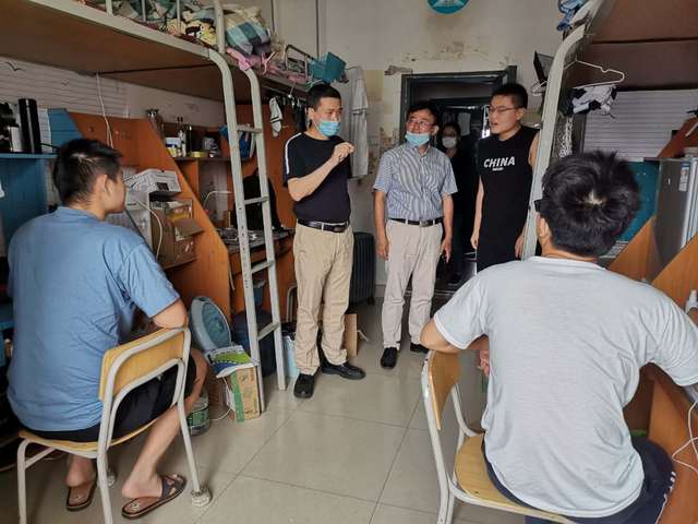 5月26日下午,工学院领导颜玄洲、张庐陵、艾施荣在科室负责人和学生辅导员的陪同下,分别到南区2栋、6楼、16栋,看望学院返校的本科学生。