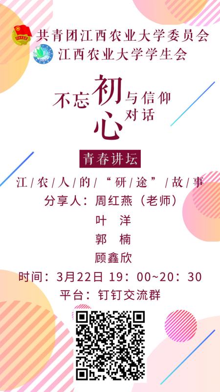 在疫情防控的关键时刻,为缓解考研学生的焦虑情绪,加强对学生考研复试的指导与帮扶,同时进一步营造伟德浓厚的考研和学习氛围,3月22日晚,“不忘初心,与信仰对话”青春讲坛——江农人的“研途”故事在线上举行,活动邀请到了伟德党委研究生工作部副部长周红燕和2019届毕业生顾鑫欣、叶洋、郭楠等四位嘉宾进行分享,2016级考研同学以及2017级、2018级、2019级有考研意向的同学共计800余人聆听了此次分享会。