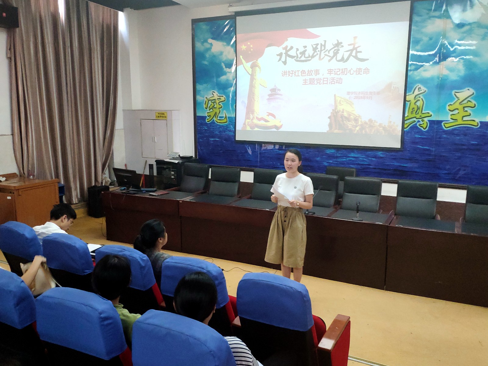 9月10日下午,理学院本科生党支部开展了 “讲好红色故事,牢记初心使命”主题党日活动。活动中,学生党员通过情景表演、朗诵、PPt演讲等多种形式再现了伟大的无产阶级革命家朱德、革命烈士刘胡兰、伍若兰等信念坚定、艰苦奋斗、不畏牺牲的红色经典事迹,并展开热烈讨论。