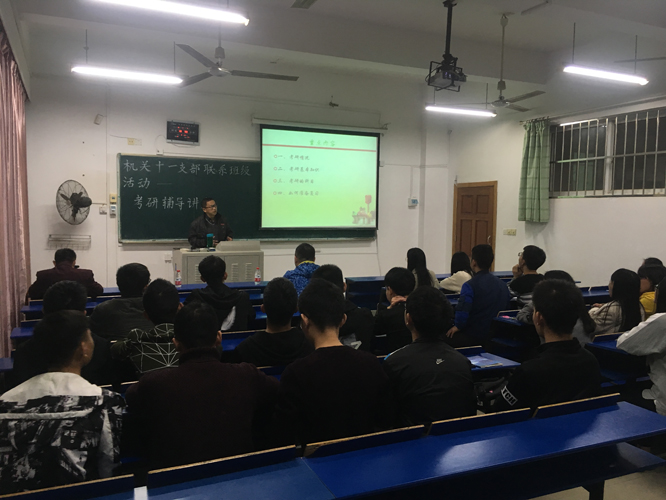 根据赣农大组〔2016〕23号文件精神,为营造浓厚考研氛围,11月4日,机关党委第十一支部组织联系班级土地资源管理1601班开展了考研辅导讲座活动。
