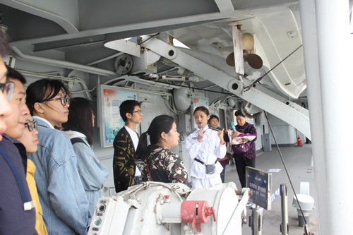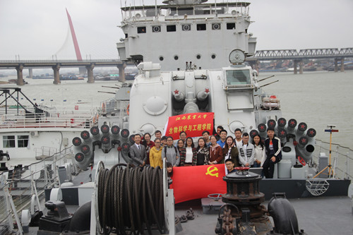 在赣江边雄伟的南昌舰,学院20名大学生党员在讲解员的带领下,参观了有着赫赫战功、曾经先后服役南海舰队和北海舰队的曾母暗沙第一锚南昌舰的风采。装载着威力巨大的双管舰炮、自动高炮、深水炸弹、反潜火箭。指挥室、舰长的房间、伙房和兵舱,党员们体会到新时代海军的雄伟力量,海军士兵保家卫国的坚强信念,唤起了大家强烈的国家自豪感,坚定了继续跟党走,实现中国梦的决心。