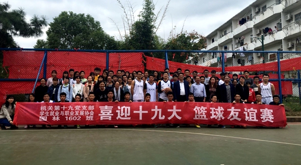 10月19日中午12时,在十九大如火如荼的召开之际,招生就业处机关第十九党支部全体党员、学生就业与职业发展协会会员和园林1602班学生在北区篮球场举行了一场篮球友谊赛。招就处处长左辉群在赛前作动员讲话,鼓励大家要响应习近平总书记的号召,加强体育锻炼,锻造健康文明的生活方式。随后左辉群为篮球赛开球,由招就处机关第十九党支部的党员老师队对阵协会与园林1602班混合队,双方在球场上你争我抢,充分展现了当代青年老师的活力、当代大学生的激情。