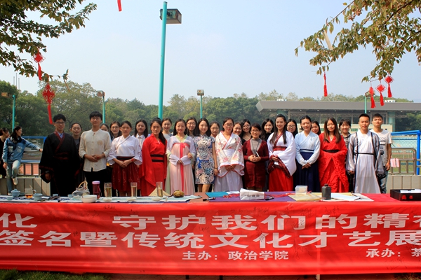 文化兴国运兴,文化强民族强。10月22日,在党的十九大胜利召开的喜庆氛围里,政治学院以“亲近中华优秀传统文化,守护我们的精神家园”为主题,在校园北区大学生活动中心室外举办了弘扬优秀传统文化签名暨传统文化才艺展示活动。此次活动由政治学院硕士生导师赵美岚老师创意策划,政治学院全体研究生组织参与,并在bevictor伟德国际1946官网大学生茶艺社、墨韵书法协会倾情协助下顺利开展。