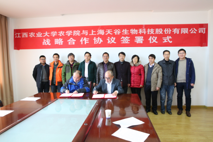 11月26日,农学院与上海天谷生物科技股份有限公司战略合作协议,双方将围绕水稻资源共享、新品种研发、项目合作、人才培养等加强战略合作。副校长贺浩华、上海天谷生物科技股份有限公司董事长兼研发中心主任罗利军出席。农学院相关领导及作物遗传育种教研室老师、研究生代表,上海天谷生物科技股份有限公司、上海市农科院、江西省种子管理站、江西省超级稻研究发展中心的相关人员参加了签约仪式