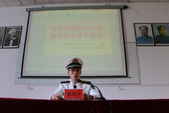 温凯华以《祖国利益高于一切 国防安全重于泰山》为主题,从我国国防建设的需要、大学生应征入伍的优惠政策和实现个人人生价值及梦想等几方面讲述了自己军旅人生的成长感受。他鼓励每个有梦想的同学都应积极响应祖国的号召,踊跃报名参军,接受祖国的挑选,到军营历练一番,做一名保家卫国、不畏艰难的钢铁战士。(校武装部 陈奎)