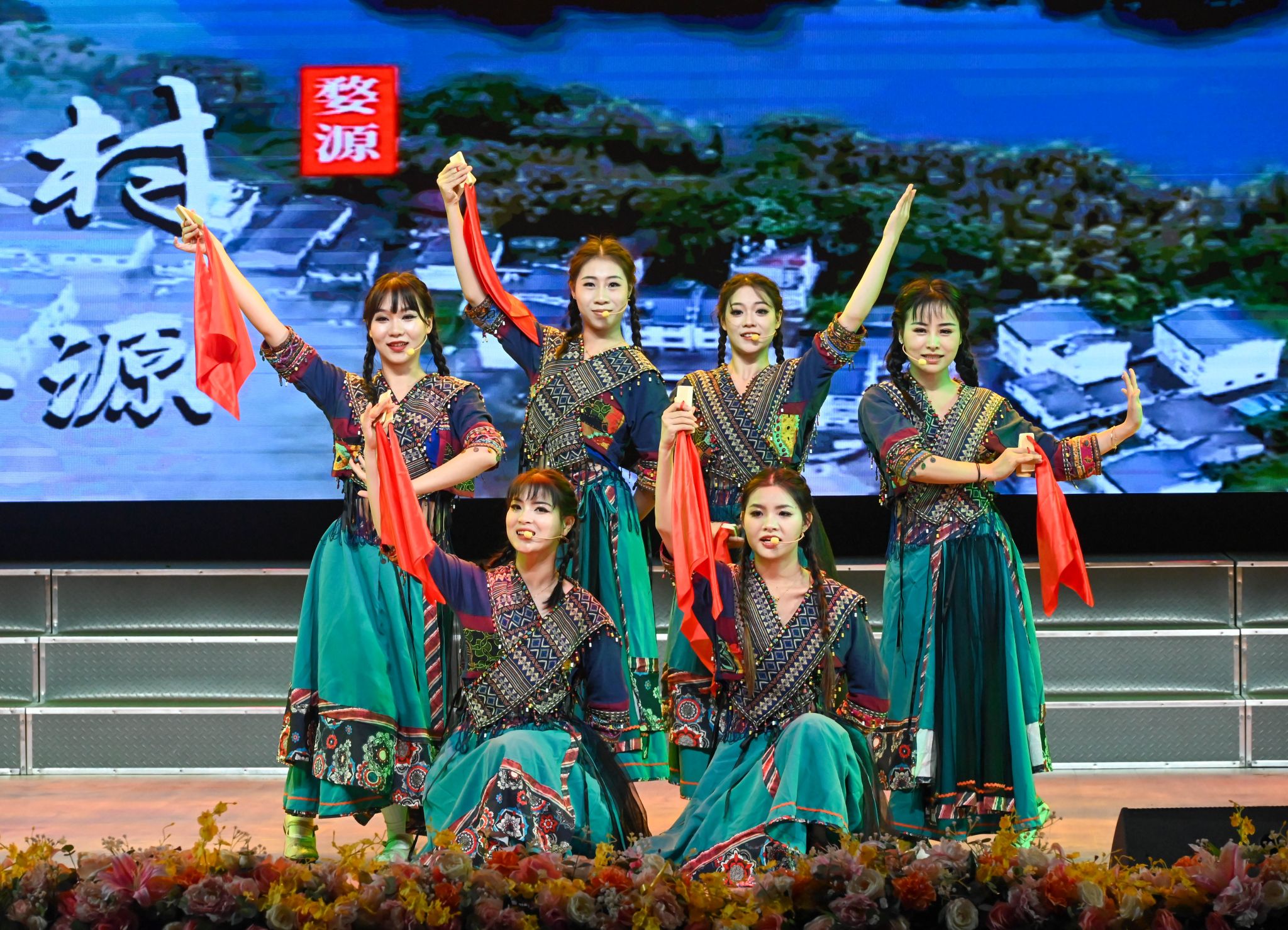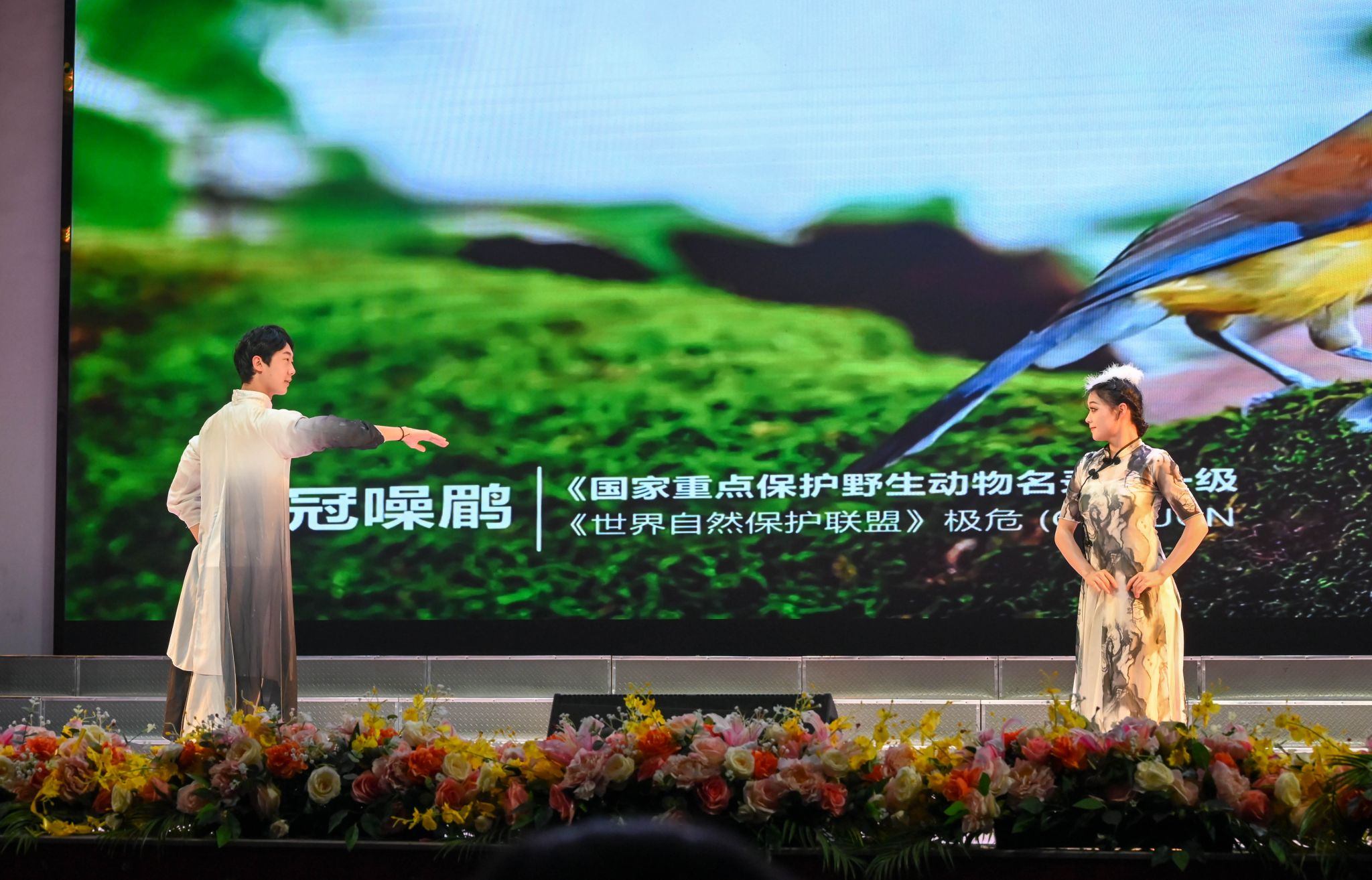 演出在婺源民歌《四季花开》中拉开序幕。笛子演奏《扬鞭催马运粮忙》、音乐快板《礼赞石门新气象》、萧演奏《绿水青山美》、吉他弹唱《石门小客栈》、双人舞《蓝冠噪鹛落石门的传说》、婺源徽剧《贵妃醉酒》、男女生对唱《婺源美》、群舞《长安三万里》等表演,为蓝冠噪鹛注入了艺术元素,古朴悠扬的旋律,让现场观众领略到蓝冠噪鹛对婺源美好生态的眷恋,优美动人的舞蹈,谱写了生态和谐的乐章,展现了人与自然和谐共生的美好画面。
