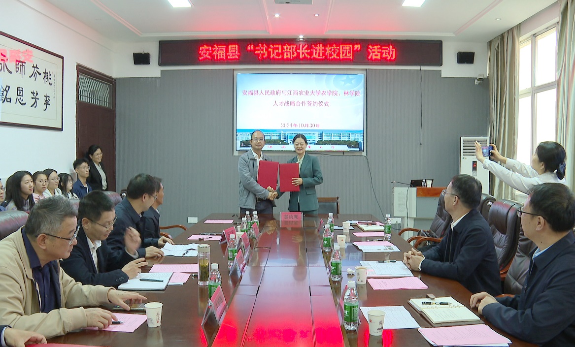 会上, 安福县政府副县长王煜代表安福县人民政府与农学院、林学院分别签署了战略合作协议,并举行了“青英归巢 才聚安福”高校引才联络站授牌和校园引才大使证书颁发仪式。