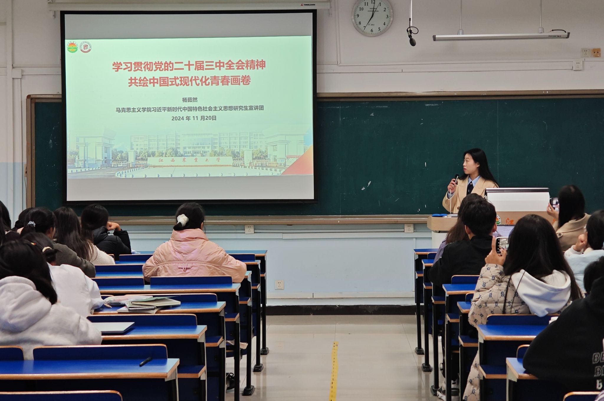 宣讲团成员分别以“共绘中国式现代化青春画卷”“推进文化自信自强,绘就新时代文化图强壮美篇章”为主题,带领同学们学习党的二十届三中全会擘画的进一步全面深化改革、推进中国式现代化的宏伟蓝图,同时围绕新时代新征程青年大学生如何担当使命任务,号召大家挺膺担当,勇毅前行,在筑梦中国式现代化的新征程上共绘新图景;聚焦党的二十届三中全会对建设社会主义文化强国的战略部署,结合自身经历和生动案例,号召青年坚定文化自信,担负起新时代新的文化使命,以高度的文化自信推进中国式现代化。