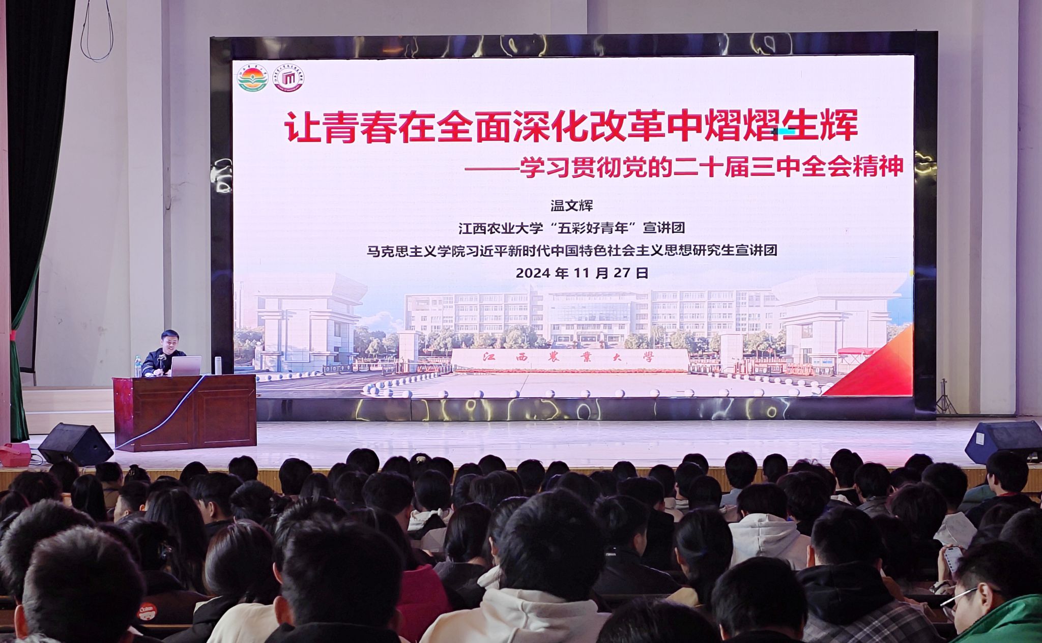为深入学习贯彻党的二十届三中全会精神,引导广大师生凝聚改革共识,11月27日下午,学校“五彩好青年”宣讲团、马克思主义学院习近平新时代中国特色社会主义思想研究生宣讲团受邀赴江西技师学院宣讲党的二十届三中全会精神。宣讲团成员以“让青春在全面深化改革中熠熠生辉”为题作宣讲。该校500余名师生参加宣讲会。
