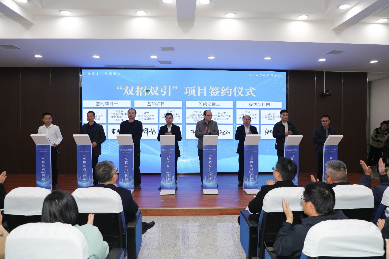 活动中,吴自胜为伟德招标与采购中心主任肖明和南昌广昌商会会长楼文正颁发了广昌县驻南昌“双招双引”大使证书。农学院副院长崔汝强、工学院薛龙和艾子平博士分别与广昌县合作企业进行了“双招双引”项目签约。李军、李智玲分别就产业和企业人才服务专员政策进行了推介宣讲。与会领导现场观摩了广昌县专场招聘活动,并与招聘单位和应聘同学们进行了亲切的交流。