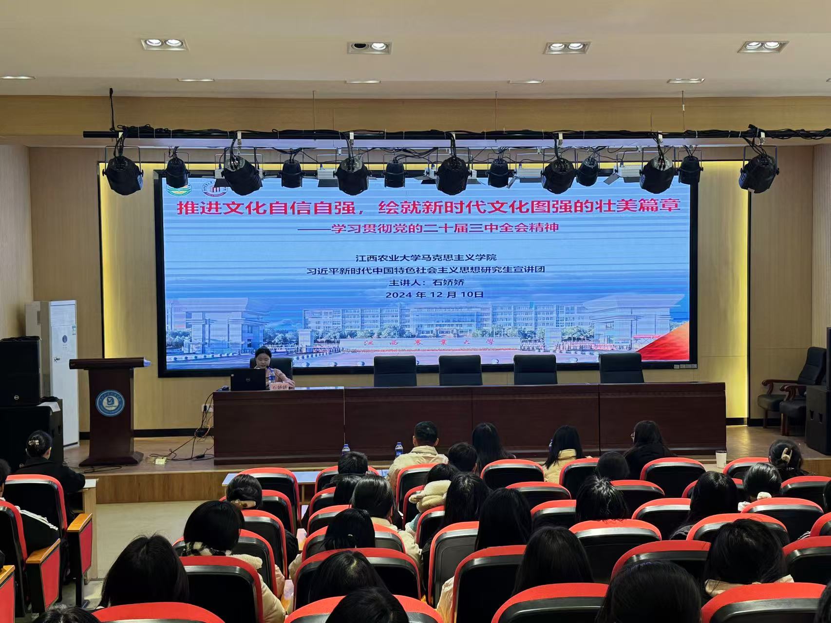 近日,马克思主义学院习近平新时代中国特色社会主义思想研究生宣讲团受邀赴江西工业技工学校宣讲党的二十届三中全会精神。宣讲团成员以“推进文化自信自强,绘就新时代文化图强壮美篇章”为题作宣讲。江西工业技工学校100余名师生参加宣讲会。