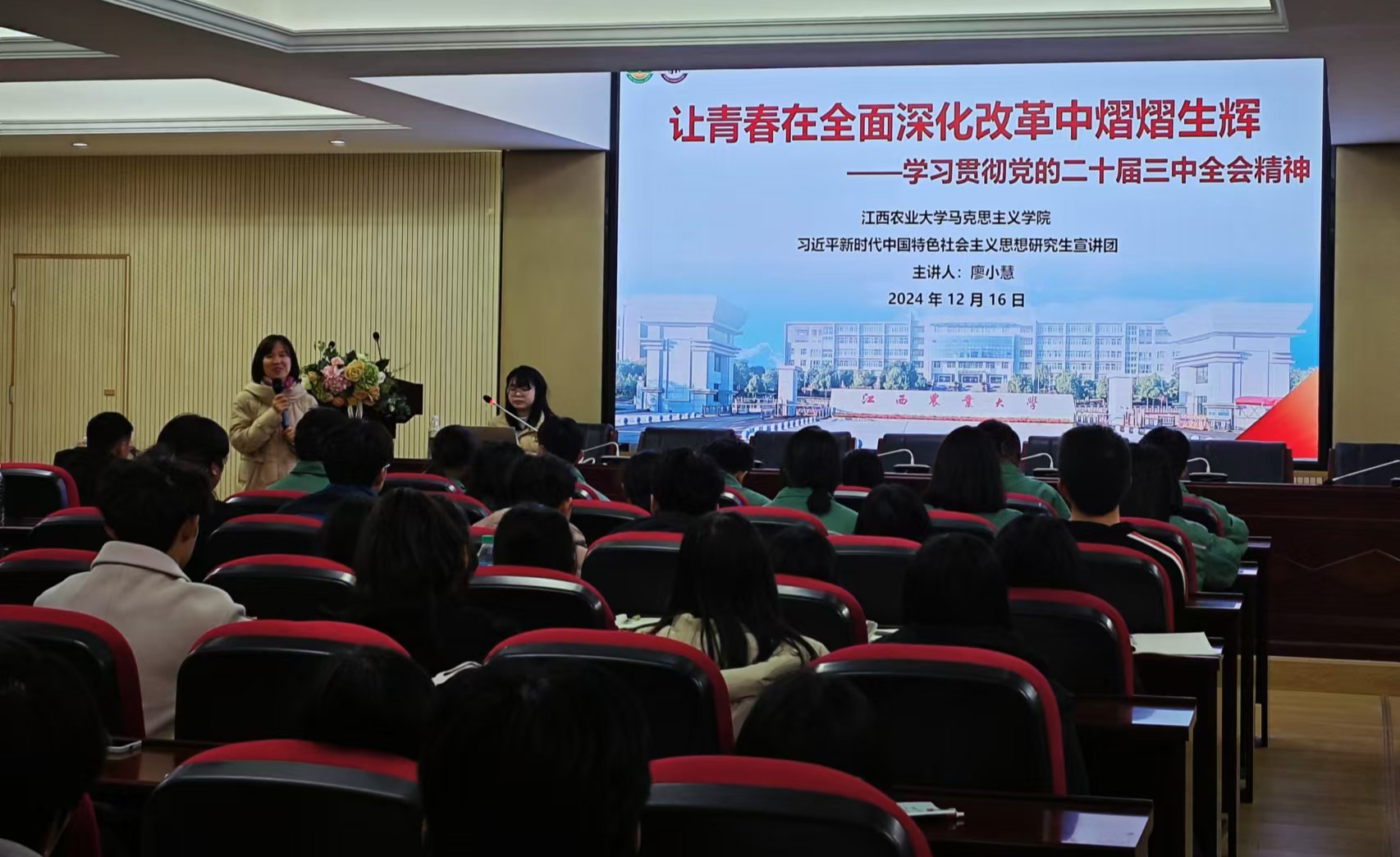 为深入学习宣传贯彻党的二十届三中全会精神,强化对青年大学生的思想政治引领,12月16日下午,马克思主义学院习近平新时代中国特色社会主义思想研究生宣讲团受邀赴江西化学工业高级技工学校宣讲,宣讲团成员《让青春在全面深化改革中熠熠生辉》为题作宣讲。江西化学工业高级技工学校师生代表共计100余人在现场听讲。