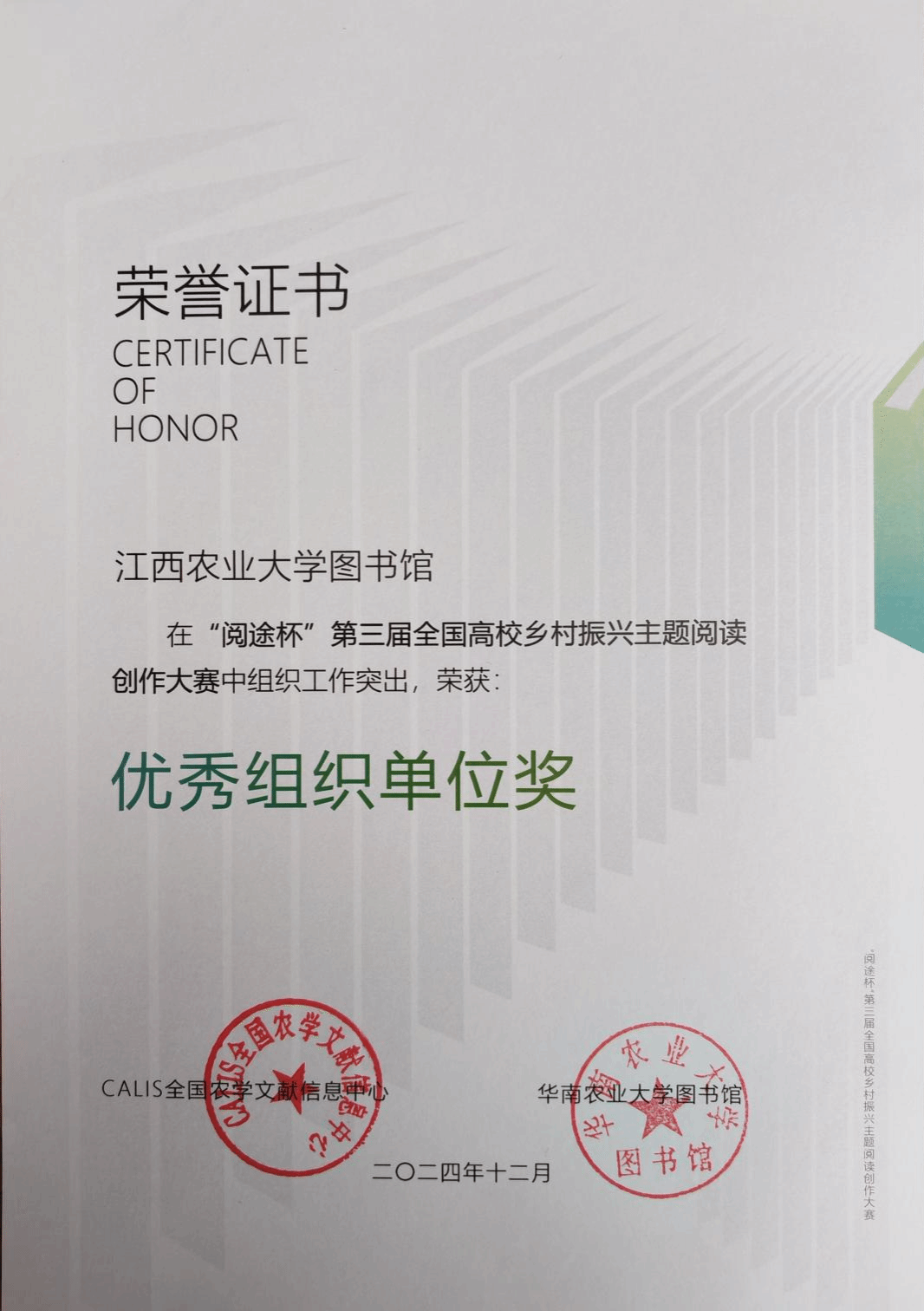 近日,由CALIS全国农学文献信息中心与华南农业大学图书馆联合主办的“阅途杯”第三届全国高校乡村振兴主题阅读创作大赛圆满落幕,伟德图书馆表现突出,荣获“优秀组织单位奖”,蔡志强、卢平英和许建红三位老师获得“优秀组织个人奖”。