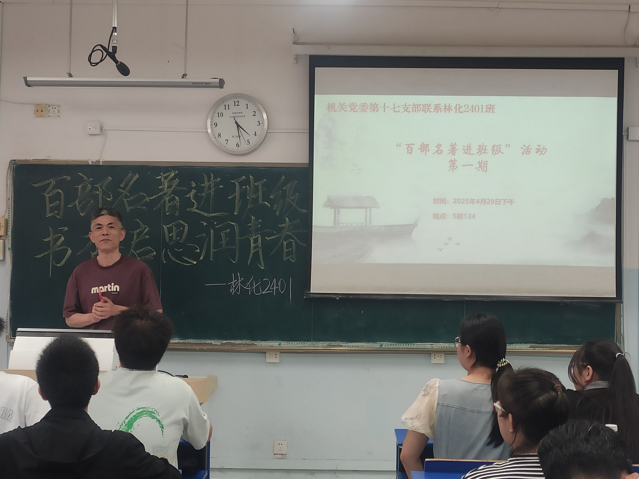 据悉,为扎实有效开展“双联系”工作,机关第十七党支部与联系班级林化2401班策划“百部名著进班级”活动,通过持续开展选名著、赠名著、读名著、谈名著等系列活动,引导班级浓厚读书氛围和全班同学养成良好的阅读习惯,助力同学们全面发展。
