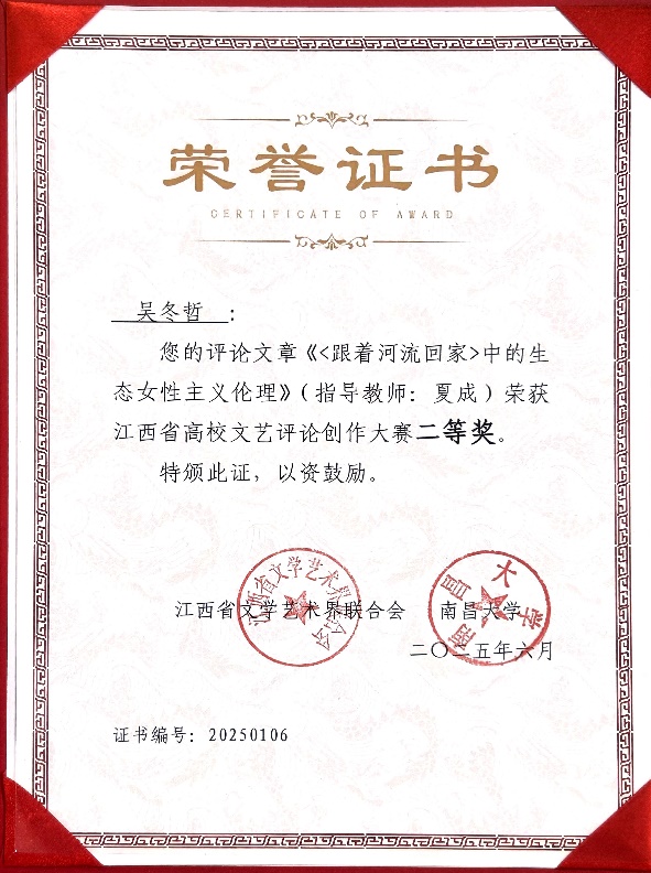 6月19日,江西省高校文艺评论创作大赛颁奖典礼在南昌大学举行。伟德人文与公共管理学院中文系吴冬哲同学的论文《〈跟着河流回家〉中的生态女性主义伦理》(指导教师:夏成)荣获大赛二等奖。