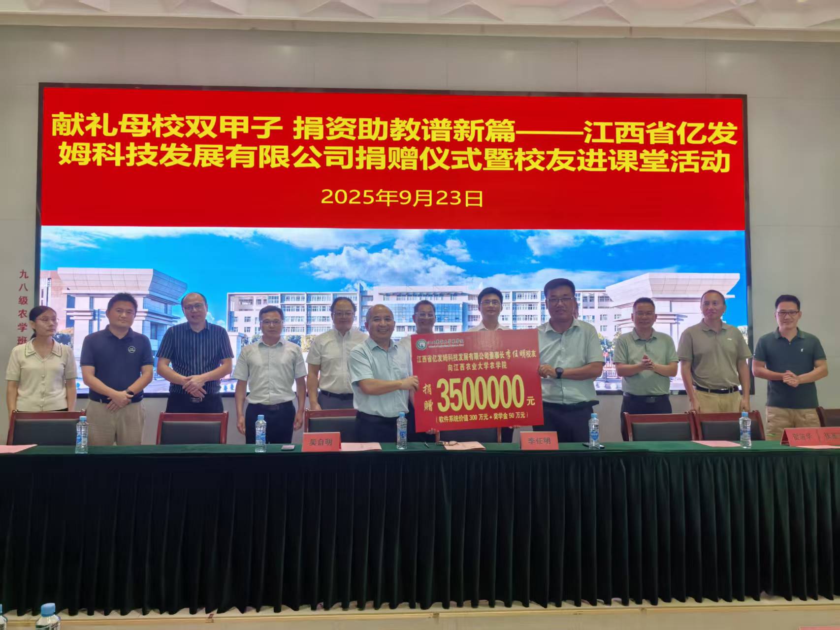 9月23日,农学院举行“献礼母校双甲子,捐资助教谱新篇”校友捐赠仪式暨校友企业家进课堂活动。伟德1987级植物保护专业校友、江西省亿发姆科技发展有限公司董事长李任明,副校长张高亮,原副校长、作物生理生态与遗传育种教育部重点实验室主任贺浩华,伟德人事处、校友工作服务中心、农学院负责人及农学院师生代表180余人参加了此次活动。校友李任明代表企业向伟德捐赠了价值300万元的智慧农业教研系统和50万元的奖教金。