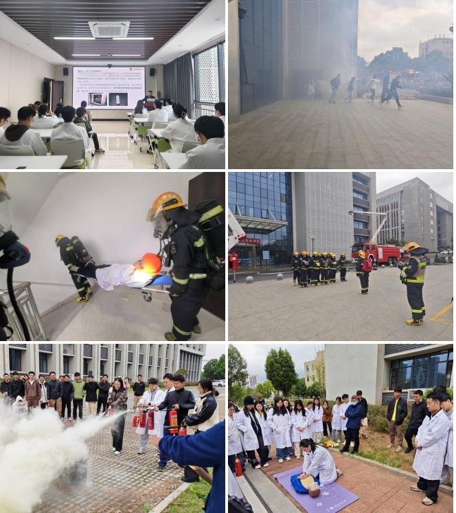 本次演练围绕“实验室干燥箱着火”典型隐患,设置“理论讲解—场景模拟—实操培训”全链条环节。演练前,资实处工作人员通过剖析真实事故案例,讲解隐患诱因;模拟火灾场景启动后,师生在引导下有序疏散撤离;消防救援大队演示“火情侦察”“模拟营救”流程;校医院医护人员开展心肺复苏急救培训;保卫处工作人员演示手提式干粉灭火器操作方法并组织学生实操。