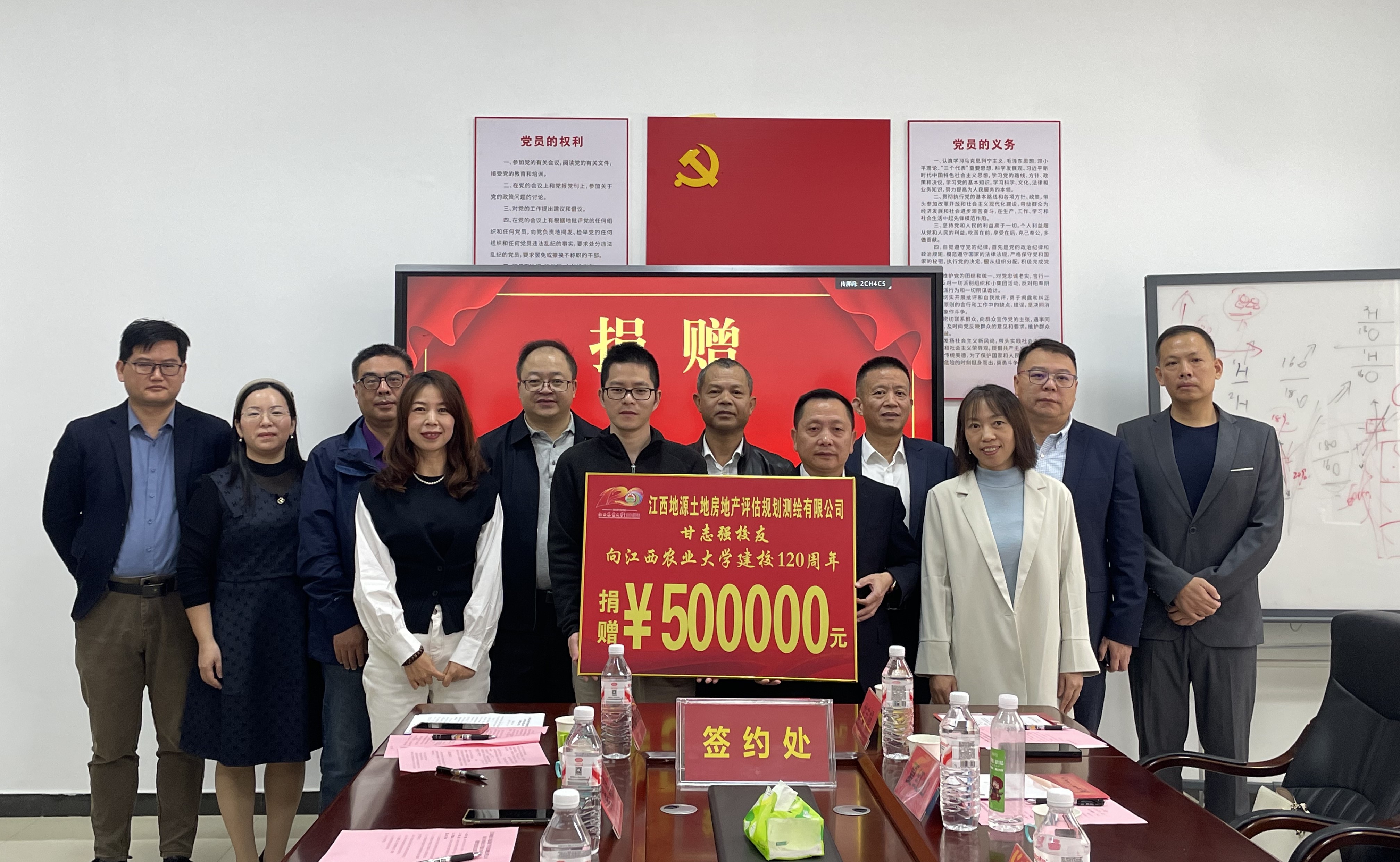 10月26日上午,江西地源土地房地产评估规划测绘有限公司捐赠签约仪式在国土学院举行。江西地源公司董事长甘志强、总经理余斌、常务副总夏红山、副总经理雷鸣、副总工程师甘志娟,学校校友工作服务中心、国土学院及师生代表出席捐赠仪式。