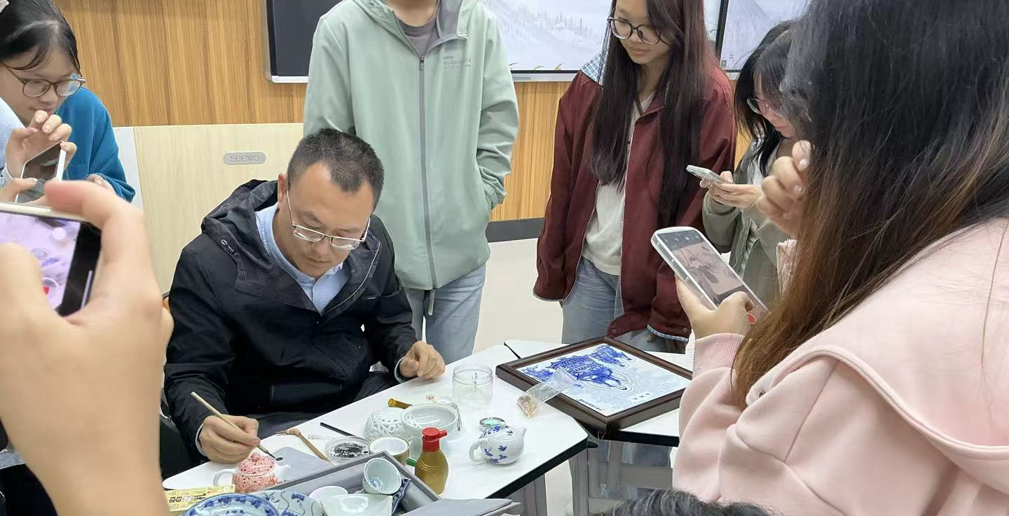 徐国华带着精心准备的瓷器藏品登上讲台,瞬间吸引了同学们的目光。他结合学习习近平总书记考察景德镇时的重要讲话精神,从瓷器的起源讲起,分析千年窑火何以绵延不绝,介绍景德镇陶瓷文化的传承发展及其在中外文化交流中的重要作用。他还结合自身陶瓷作品的创作,展示其中蕴含的文化魅力。
