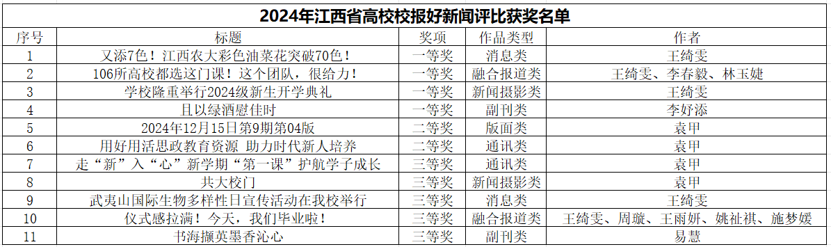 据悉,全省高校校报好新闻评选活动是由江西省高校校报研究会主办,旨在展示全省高校校报的工作成果,发挥优秀新闻作品的示范作用,推动高校新闻媒体事业发展,服务于党的宣传工作,服务于教育事业发展的大局。该奖项分为消息、通讯、评论、副刊、版面、新闻摄影、融合报道等七类,是全省性年度优秀校报新闻作品最高奖项。