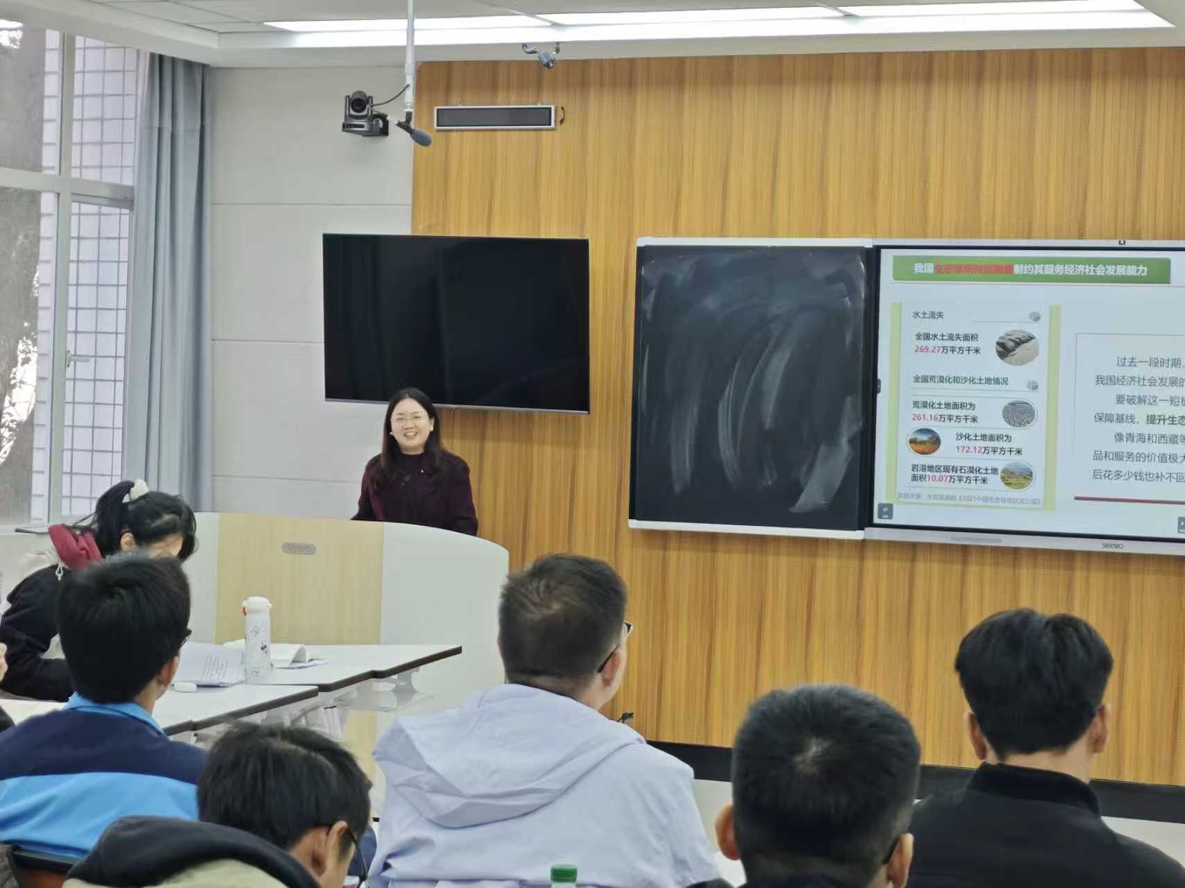 黄晓凤围绕“新时代为什么要突出生态文明建设”“党的十八大以来生态文明建设有哪些成就”等内容展开深入讲解。她用详实的数据、鲜活的案例,从顺应文明发展进程、破解发展短板、满足人民生态需求、应对全球挑战等维度,系统阐释新时代加强生态文明建设的重大意义。随后,她从理论创新、制度创新、实践创新等方面,全面梳理了党的十八大以来我国生态文明建设取得的历史性成就。通过讲解,同学们对习近平生态文明思想的深刻内涵、真理力量和实践伟力有了更为深入的学习。