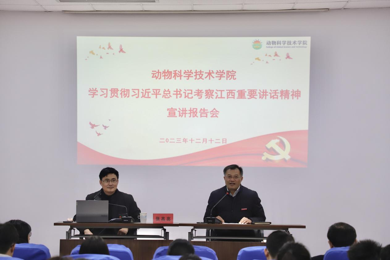 在全校上下深入学习贯彻习近平总书记考察江西重要讲话精神之际,12月12日下午,副校长、党委委员张高亮赴动科院作宣讲报告,学院师生党员、团员青年等100余人聆听报告。
