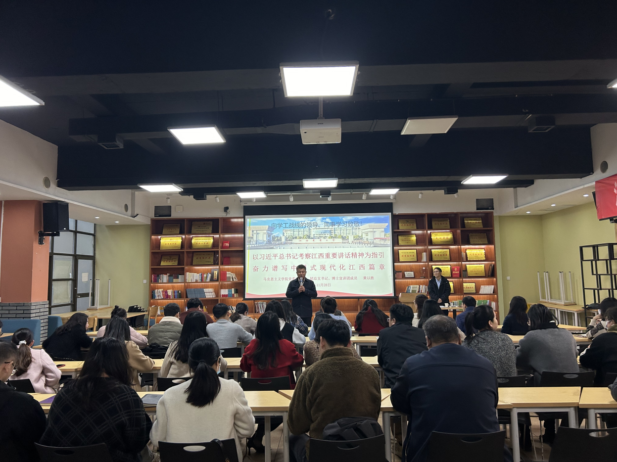 学校马克思主义学院博士宣讲团成员黄以胜老师结合自身学习体会,用“以习近平总书记考察江西重要讲话精神为指引奋力谱写中国式现代化江西篇章”为题,对习近平总书记考察江西重要讲话进行深度解读,从时间节点、殷切希望、任务要求等方面,系统介绍了习近平总书记考察江西的基本情况和重大意义,并重点对江西高质量发展和人民共同富裕进行了详细的讲述,通过纵横双向对比,在对江西发展明确的重点任务进行剖析的同时,还结合发展实例,进行了深入浅出的精彩讲解。