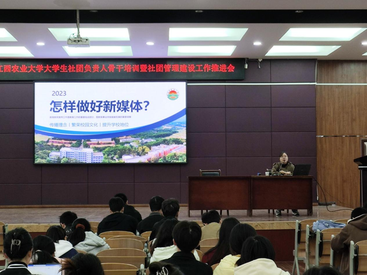 校团委副书记王成斌以“走在前,勇争先,善作为,奋力谱写学生社团高质量发展新篇章”为主题,以习近平总书记考察江西重要讲话精神为切入点,勉励学生社团解放思想,开拓进取,扬长补短,固本兴新,在学生思想政治引领上走在前,在促进学生成长成才上勇争先,在服务学校高质量发展上善作为。王绮雯老师以“怎么样做好新媒体?”为题,从照片拍摄技巧、活动宣传策划和微信公众号排版等方面为同学们传授新媒体工作技巧。廖冰以“社团建设与管理”为题,针对学生社团建设管理实施细则,从组织建设、指导规范、经费管理及注册年审等,做了逐一解读,并强调要切实遵循实施细则,坚持纪律原则,注重方式方法。校团委第二课堂部学生负责人田铮以“第二课堂发起”为主要内容从实操角度讲授了第二课堂PU校园相关活动。