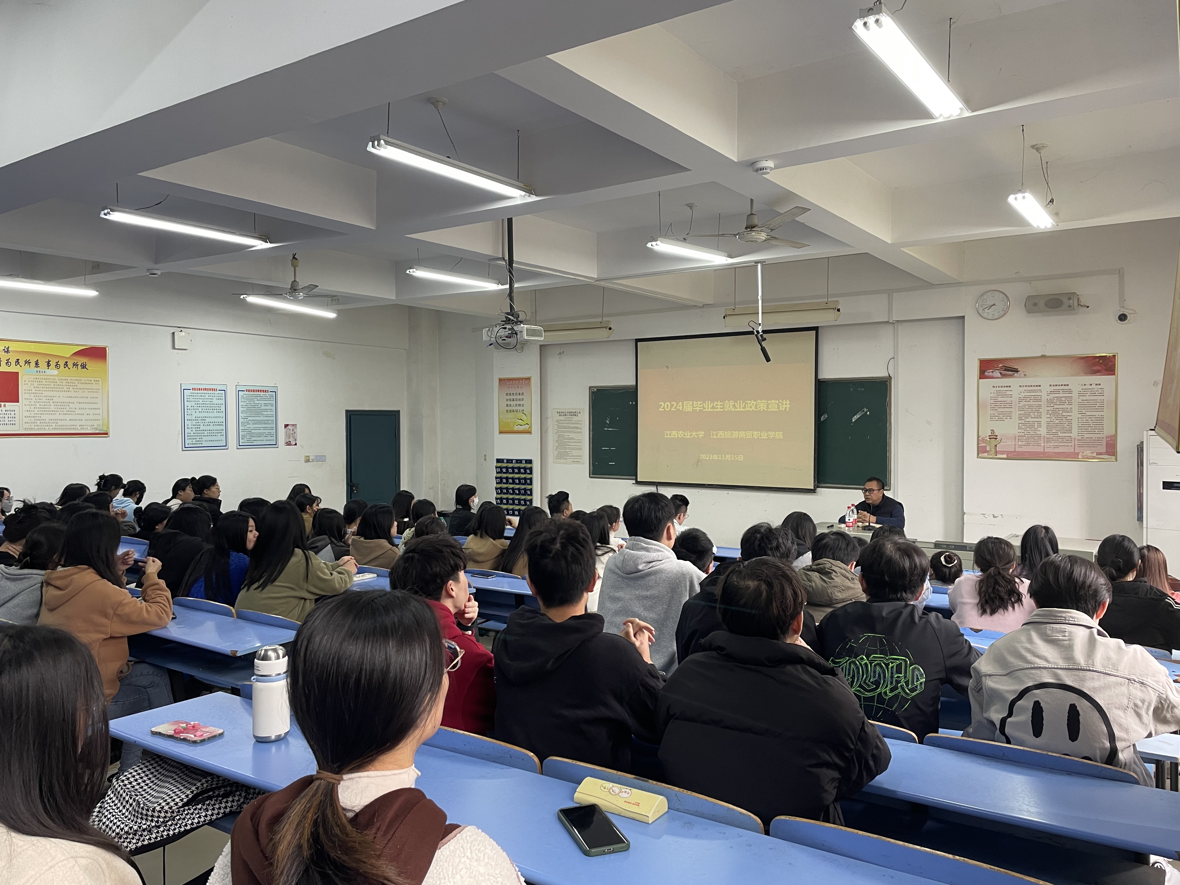 为促进学院2024届联合培养毕业生了解就业政策,增强就业意识,推动顺利毕业,实现高质量就业,助力学院2024届毕业生就业工作取得实效,11月15日下午,经管学院前往江西旅游商贸职业学院为2024届联合培养专升本会计学专业89名毕业生做就业政策宣讲。