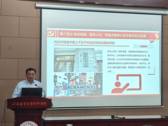 软件学院党委书记肖意风结合歌咏曲目《我的中国心》,以《我的中国心,我的中国“芯”》为题讲授理论党课,从中国心的内涵出发,对当代中国爱国主义的本质就是坚持爱国和爱党、爱社会主义高度统一进行了阐释。围绕“心、芯、新”三个维度,分别从高举爱国主义旗帜的“中国心”、掌握关键核心技术的“中国芯”、践行强农兴农的“新高地”三个部分讲授理论党课。并结合习近平总书记考察江西重要讲话精神,聚焦“走在前、勇争先、善作为”的目标要求,对师生党员提出三点希望:一是把代码写在祖国大地,解放思想、开拓进取,练就过硬本领;二是把奋斗作为青春底色,扬长补短、固本兴新,担当时代使命;三是把修为嵌入人生算法,再接再厉、乘势而上,实现梦想抱负。