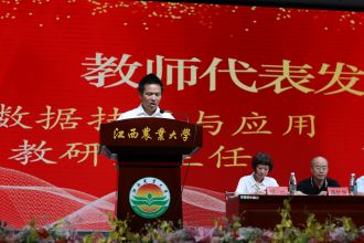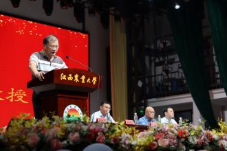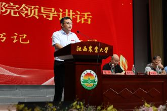 教师代表杨红云教授,老生代表、“江西省最美大学生”刘磊锟和新生代表先后作了发言,院领导为2023级新生代表佩戴校徽。