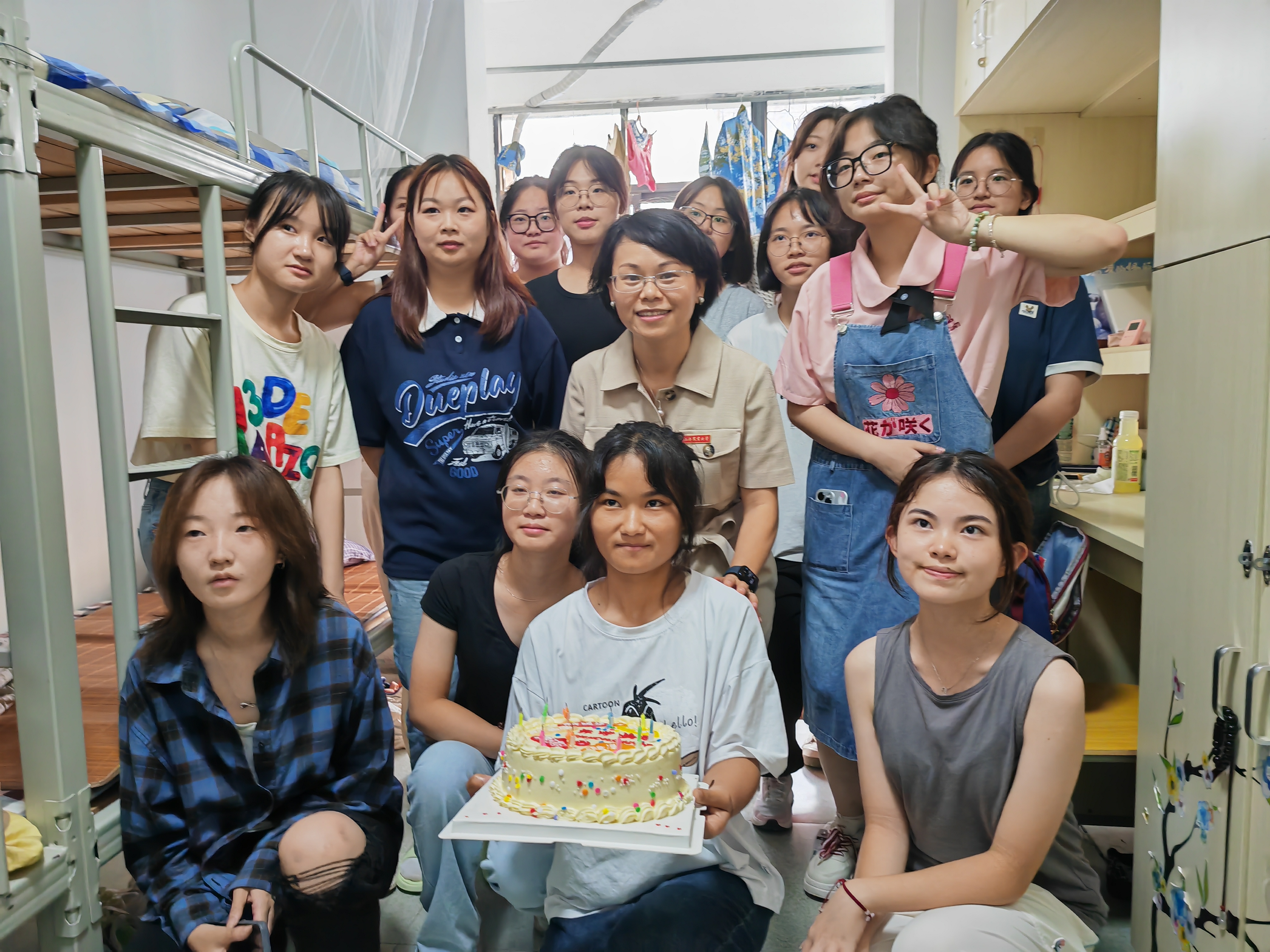师长新友同庆生,上好团结奋进课。“第一次和这么多朋友一起过生日,特别感动。”手捧生日蛋糕的哈尼族女孩、园林2301班新生马推芳激动地说。了解到报到当天有新生过生日,下寝慰问的学院党委书记刘纯青、院长陈伏生带上了生日蛋糕,与全体辅导员、2023级学生一道为四位园林“小寿星”庆生,共绘相亲相爱、团结奋进的园林故事。