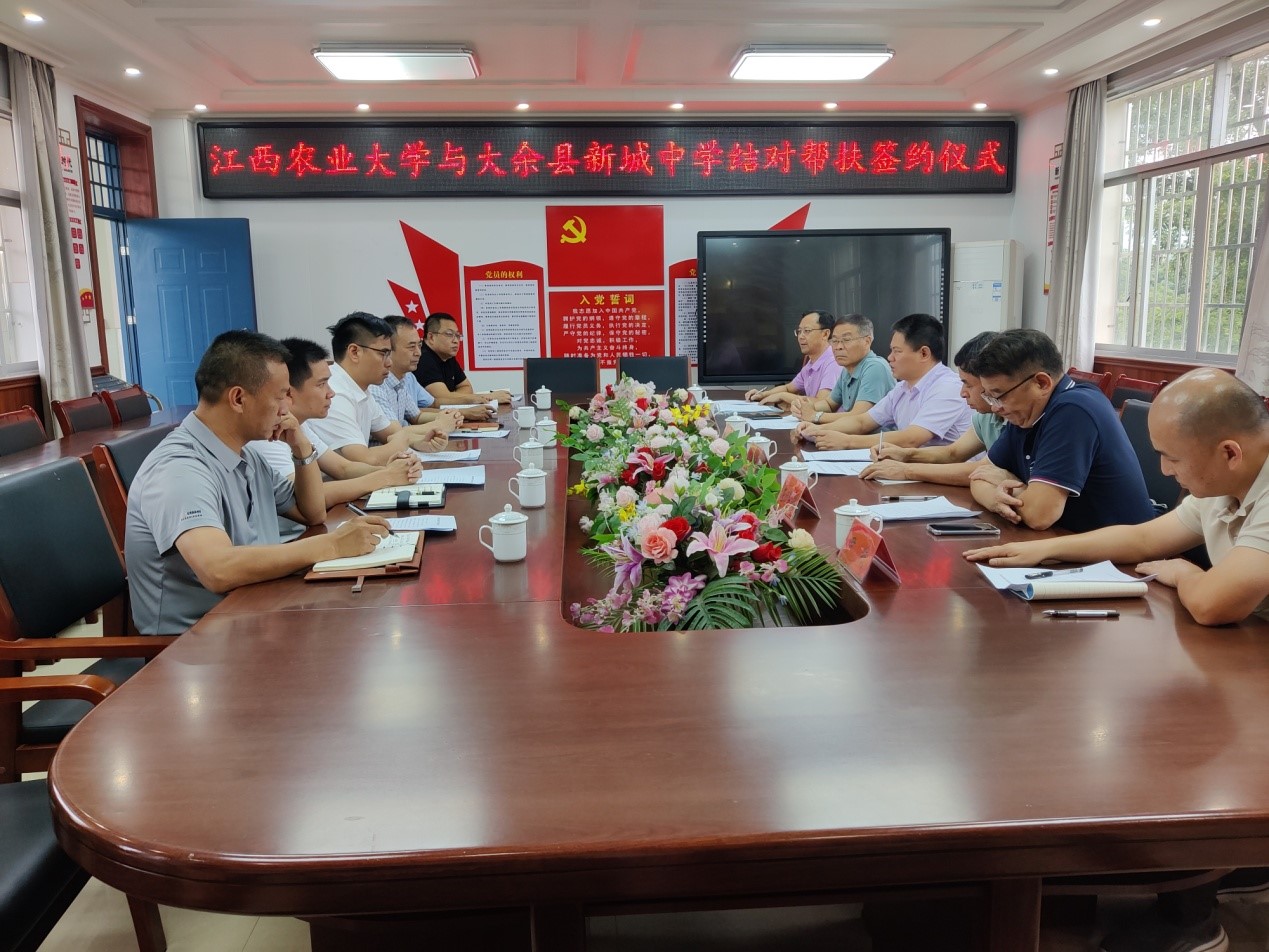 蔡海生一行首先来到结对帮扶中学---大余县新城中学实地调研,与大余县教体局负责人、新城镇党委主要负责人、中学负责人、教师代表亲切交谈,并与新城中学签订了结对帮扶意向协议书。随后,蔡海生一行来到杨梅村bevictor伟德国际1946官网帮扶产业示范园区调研,走进麻鸭种蛋孵化基地,了解大余麻鸭的孵化养殖技术、育种保种情况等,要求学校相关专家切实加强技术指导,鼓励养殖能手扩大规模,延伸麻鸭产业链,带动周边村民增收致富。蔡海生一行还沿路了解2023年度江西农大重点帮扶项目——百亩优质稻示范种植情况,肯定了“双季连作,一品双种”新型种植模式。随后,蔡海生一行查看了伟德支持建设的杨梅村文化广场,听取该村发展历程和文化底蕴介绍,见证村民不断“升级”的幸福生活。