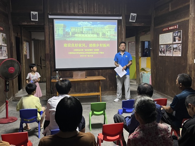 进村入户传党音。营队利用晚上时间,走村串户,传递党的好声音、好政策。队员朱伟、于雅文分别以“加快建设农业强国”和“建设良好家风,推动乡村振兴”为主题,在童心港湾开展“微”宣讲。朱伟以农业高校学子懂农业爱农村爱农民的特有情怀,围绕建设农业强国的时代背景、具体举措、重点工作、首要任务等内容,用通俗易懂的语言、生动具体的案例向村民群众作详细讲解。于雅文以“建设良好家风,助推乡村振兴”为题,讲解了习近平关于家风建设的重要论述,并结合家风故事介绍了家风建设在推动乡村振兴方面的价值。“微宣讲”贴近群众、贴近基层,接地气、冒热气。