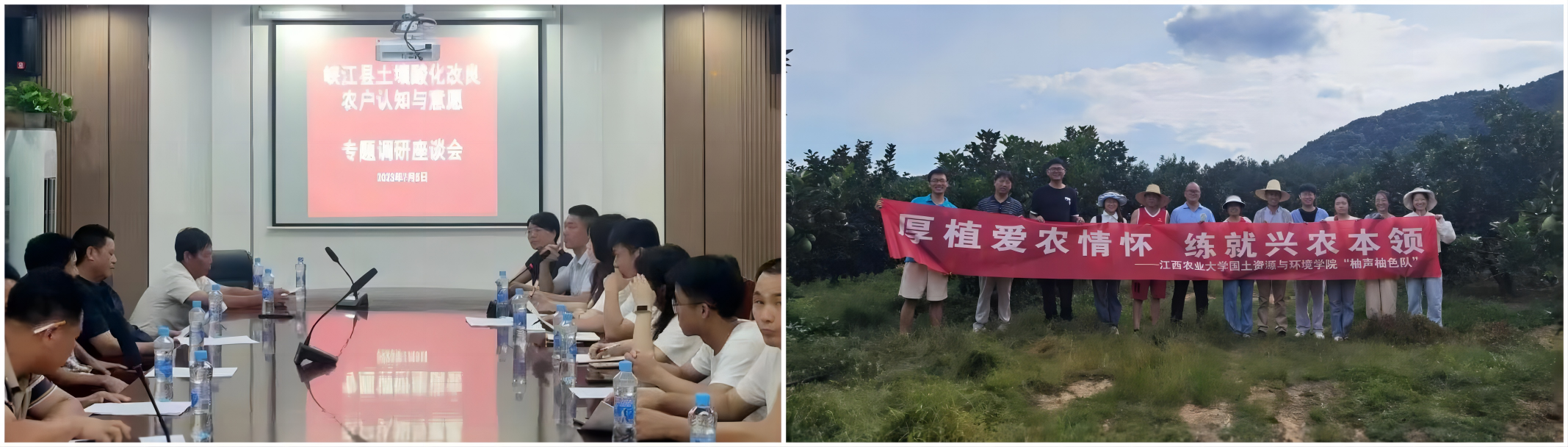 井冈蜜柚科技小院实践队队员,对安福县16个乡镇柚园,58个农户进行问卷调研和实地取样。了解井冈蜜柚施肥管理和种植状况、果园土壤和树体养分状况、果园病虫害状况等,找到限制安福县井冈蜜柚产业发展限制因子,指导当地农户种植生产。“红心振乡实践队”队员来到书楼村深入调研书楼村文旅融合,产业振兴发展情况,并结合自身学习旅游规划、旅游生态、文化讲解等专业知识,就人居环境整治提升、改善村容村貌、融合红色研学等内容提供了相应的建议。“良土育粮实践队”前往江西省贵溪市与峡江县两地进行实地考察,访谈了300多户农民,对农户土壤酸化认知,土壤酸化改良新技术采纳意愿等方面进行调研,助推酸化耕地治理政策有效落地。