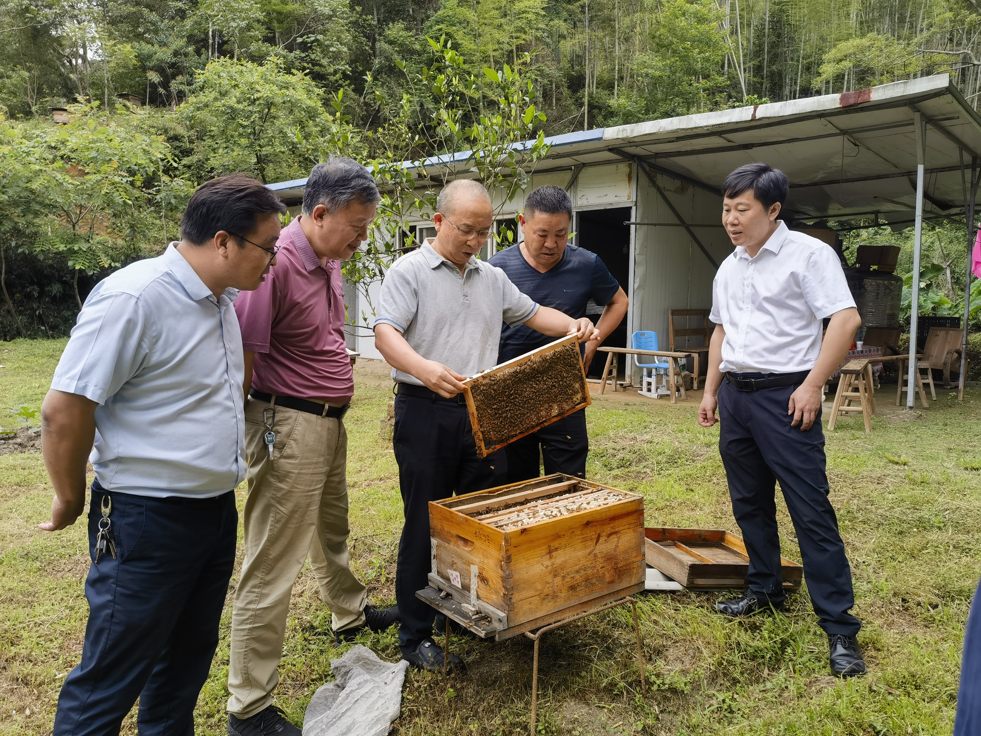 曾志将一行走访了资溪县“头雁”学员养蜂基地及资溪县竹溪林场养蜂基地,充分肯定了学员养蜂基地的精细化管理工作,并讲授了蜜蜂养殖和蜂蜜加工的关键技术,向学员赠送了养蜂书籍和自主研发的蜜蜂免移虫育王器,并殷切嘱托学员要加强蜂农之间的交流,充分发挥“头雁”领航作用,增强“辐射联动力”,促使当地养蜂产业稳步向前发展,同时建议县里要建立养蜂产业协会,形成强大合力振兴养蜂产业。