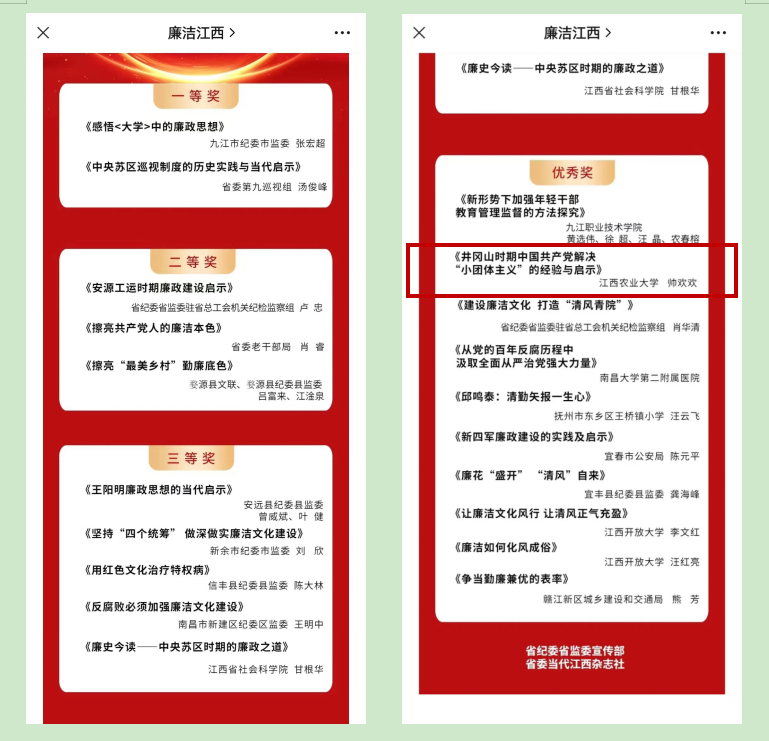 近日,由省纪委省监委宣传部与省委当代江西杂志社联合举办的“加强廉洁文化建设 全面建设勤廉江西”主题征文评选结果揭晓。伟德帅欢欢老师撰写的文章《井冈山时期中国共产党解决“小团体主义”的经验与启示》喜获优秀奖。