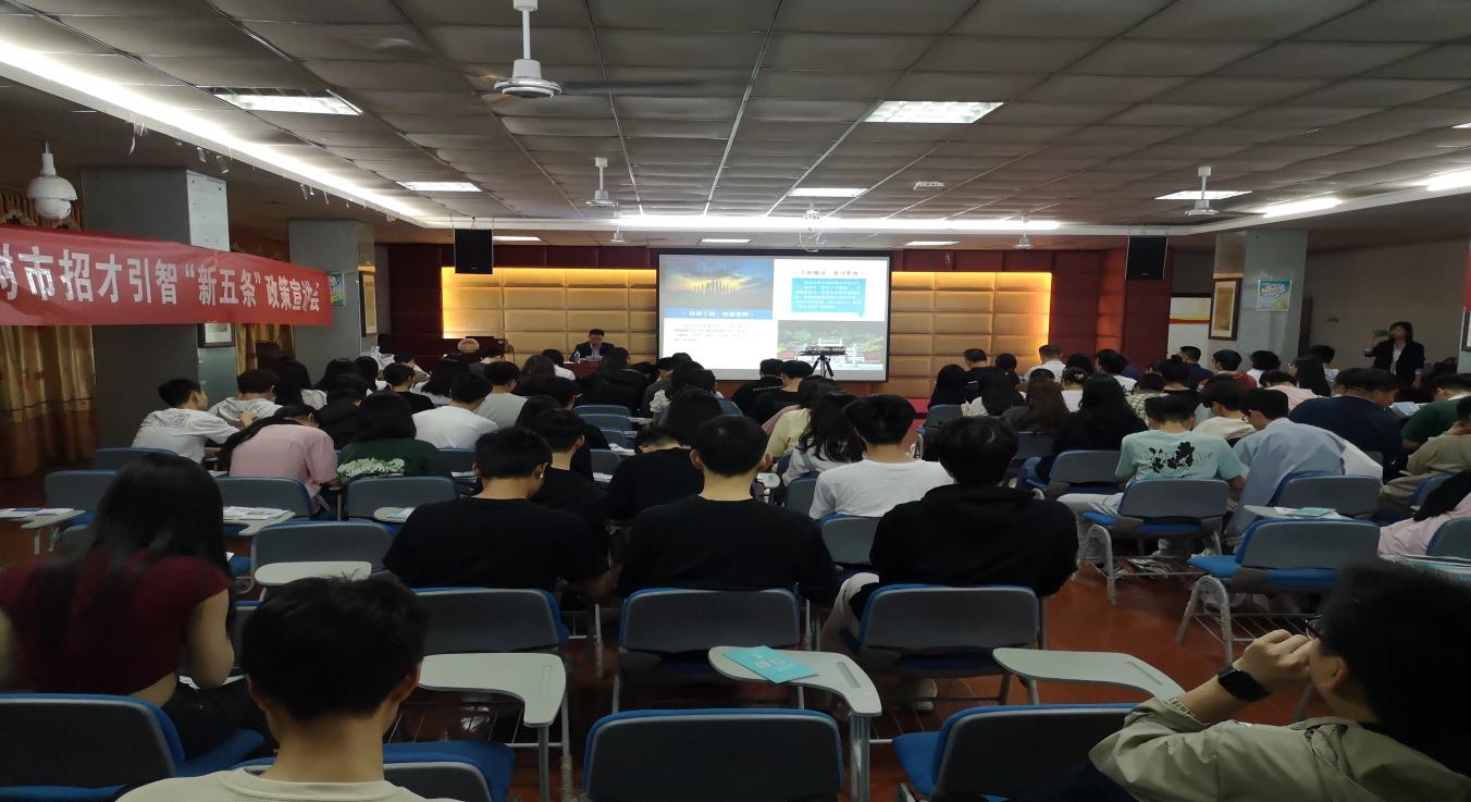 4月18日下午,樟树市委常委、组织部部长金小明一行来校开展樟树市招才引智“新五条”政策宣讲会。樟树市有关部门负责人、部分优质企业代表,招就处负责人及相关学院就业工作人员、2023届毕业生代表等近130人参加了此次活动。