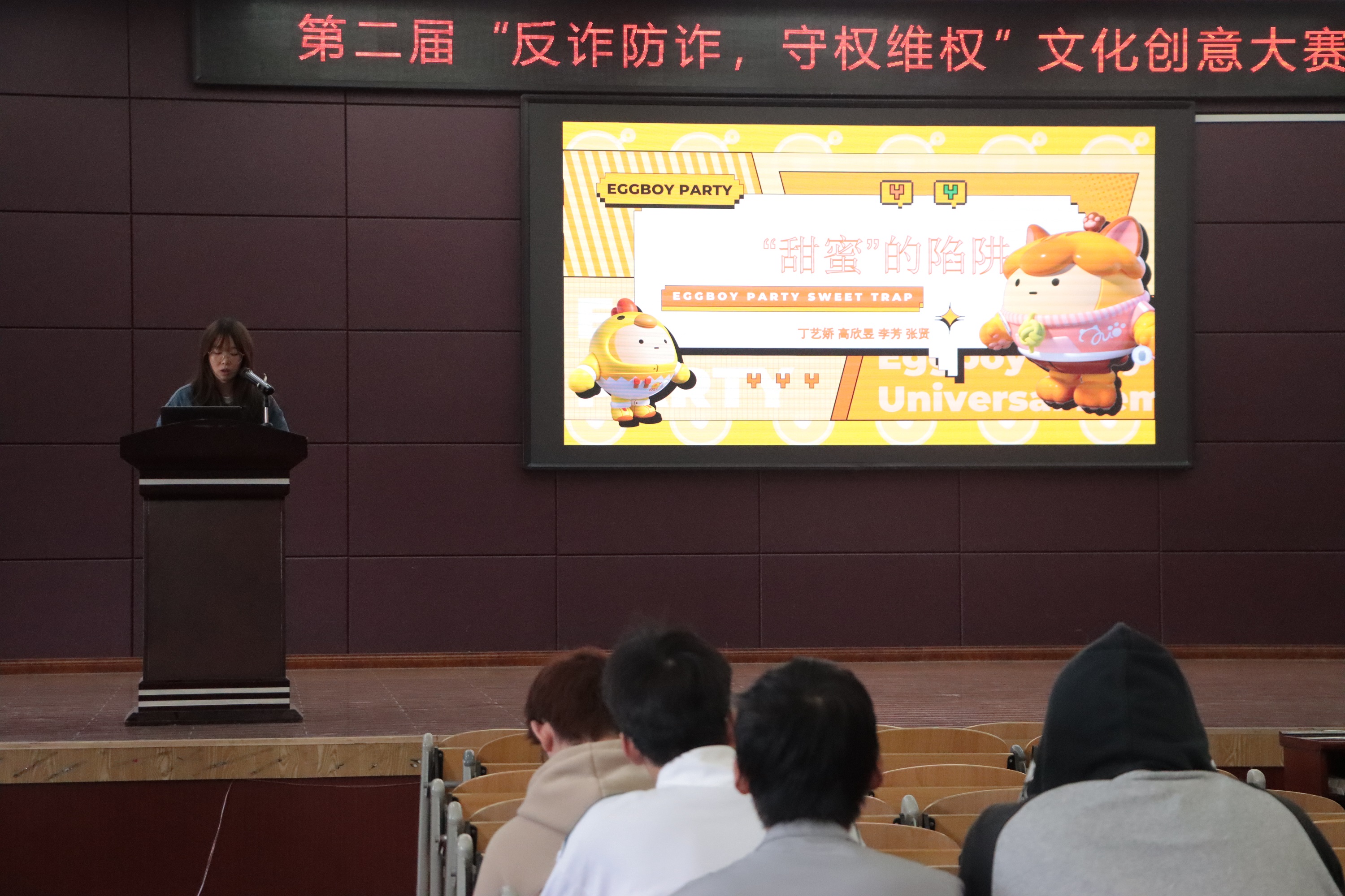 本次大赛包含作品征集和现场演说两个环节,各班级通过绘制海报和标语,自制动画、视频,围绕网络刷单返利、校园贷、杀猪盘等受骗类型宣传防范网络诈骗知识,阐释了提升防诈反诈的重要性。经过筛选,10名作品进入到现场展示演说环节。选手们结合自制原创文创作品,通过以案说法的方式向在场同学们展现了常见的诈骗套路、手段以及如何应对的措施、方法,生动地向在场观众宣传了防诈骗知识,将反诈宣传深入人心。