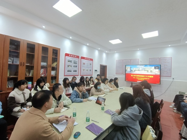 为深入学习宣传贯彻党的二十大精神,增强新一代青年使命感和责任感,3月21日下午,马克思主义学院习近平新时代中国特色社会主义思想研究生宣讲团受邀赴外国语学院宣讲党的二十大精神。宣讲团副团长朱伟以“深入学习贯彻党的二十大精神”为题生动开讲。外国语学院学生党员及入党积极分子近30人在现场聆听,10余人在线上同步收听。外国语学院本科生党支部书记主持宣讲会。