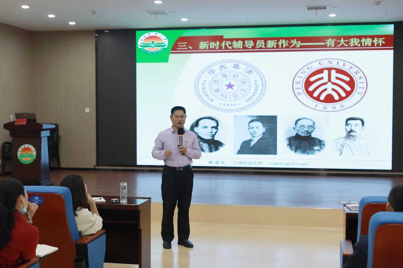 10月28日上午,校党委副书记蔡海生在全校辅导员培训班上,以《如何做一名有情怀的新时代辅导员》为题给全体辅导员上了一堂有情、有理、有力的培训课。
