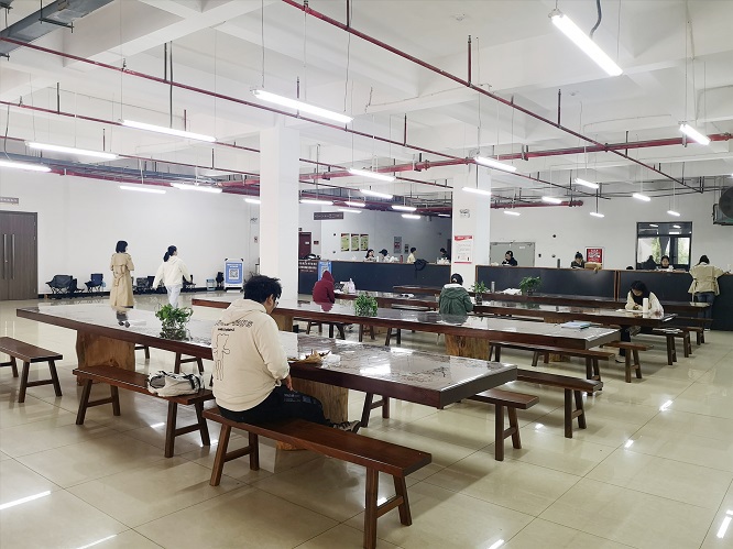 为进一步完善图书馆读者服务功能,满足部分读者大声朗读、休闲和用餐的需求,图书馆在一楼设置了休闲区。近期,图书馆购置了46米长实木大板桌和多张配套长凳,对该区域的桌凳进行了统一更换,新的桌凳款式一致、整齐划一,木质纹理流畅,自然色泽温润,尽显图书馆质朴大气风范。用餐时段,读者可以在此就餐,非用餐时段,读者可以在此学习休闲。休闲区临近图书馆报告厅和考研自修室,既满足了读者学习、朗读及用餐需求,又有效改善了图书馆报告厅和考研自修室环境,受到读者一致好评。
