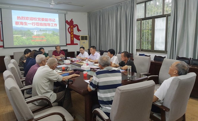 6月29日下午,校党委副书记蔡海生到离退休工作处开展调研,党办校办、科技处、新农院负责人陪同。离退休校领导陶茂、杜天真、王华林,离退休党支部书记代表,老科协、老体协负责人及离退休处全体人员参加调研座谈会。