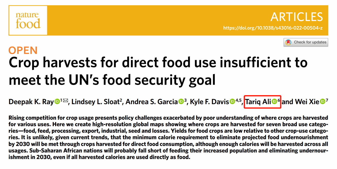 近日,经管学院Tariq Ali教授合作研究成果《Crop harvests for direct food use insufficient to meet the UN’s food security goal》在Nature子刊《Nature Food》上发表。美国明尼苏达大学环境研究院Deepak K. Ray教授为论文第一作者和唯一通讯作者。该研究绘制了七个最终用途的作物收成图,发现直接用于粮食的作物收成不足以满足联合国可持续发展目标,即到2030年保障人人享有粮食安全。