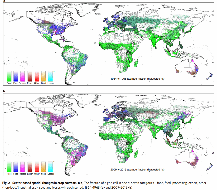 地图显示,自1960年代以来,全球范围内为直接食用而收获的作物比例有所下降,而用于加工(动物饲料、高果糖玉米糖浆、氢化油)、出口和工业用途(乙醇、生物塑料、药品)的作物收获比例有所增长。如果这一趋势持续到2030年,全球收获的农产品中的卡路里可能只有约26%用于直接食用。